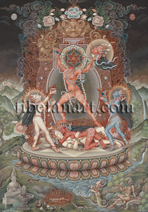 Chinnamasta and her two yogini attendants, Varini and Dakini, manifest together amidst a blazing mass of awareness fire as Chinnamasta dances upon the copulating forms of white Shiva and red Parvati, who lie together on the wide moon-disc of a multi-colored double lotus. In reversed sexual union Parvati lies on top of Shiva, her naked body adorned with gold and bone ornaments, her hair disheveled, her arms embracing Shiva's neck, and her three eyes gazing passionately at his face. Shiva lies passively upon the six-pointed star that adorns the moon disc, wearing a loosened tiger-skin loincloth, a five-skull crown, rudraksha bead ornaments, and the naga-serpent Vasuki that coils around his neck. Shiva has three eyes, and his matted locks and topknot are crowned with a white crescent moon.