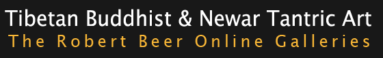 12. Dainichi Nyorai (Vairocana), the 'Illuminator', appears at the upper right and directly above the Medicine Buddha. As Mahavairocana, the 'great shining one', he is the main central deity of the Vajradhatu Mandala and the principal Buddha of the Shingon sect. He appears here in the form of a white Bodhisattva who bears the small images of the Five Buddhas on his crown. With his two hands Vairocana makes his specific bodhyangi-mudra or gesture of 'principal enlightenment', which is performed by enclosing the raised forefinger of his left hand within the 'wisdom fist' of the fingers and thumb of his right hand. This gesture represents the element of wind or 'life' being embraced by the Five Buddha Wisdoms.